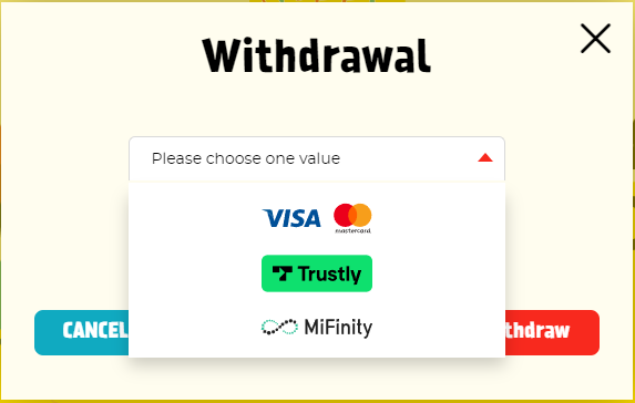 - Choose Your Withdrawal Method - The screen that pops up will prompt you to choose your withdrawal method from a drop-down list. You can only choose from methods you’ve previously used to deposit as well as Trustly and Kassu Casino MiFinity. On this page, you also enter your withdrawal amount. Each transaction has a minimum withdrawal amount of £10.